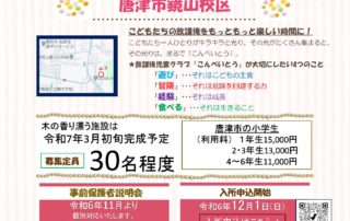 令和7年4月に鏡山小学校校区に放課後児童クラブ「こんぺいとう」弐番館を新設いたします。 令和7年2月末~3月初旬に建物のお披露目予定。 説明会や募集に関しては後日お知らせいたします。弐番館チラシ① [...]